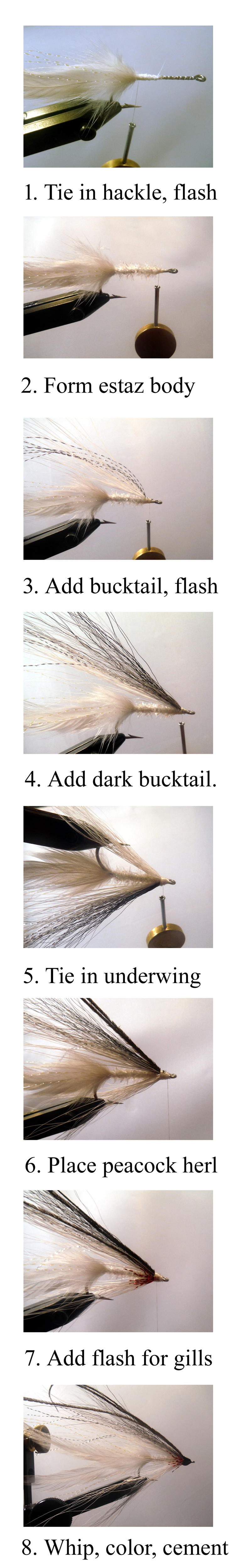 At that point, tie in a sparse pinch of white bucktail with even tips and add a few strands of silver krystal flash (3). On top of that, add a pinch of bucktail with gray layered under black in the same length as the white layer (4). Flip the hook over and tie in another sparse pinch of white bucktail as the underwing, before rotating the vise back to the standard holding position (5).