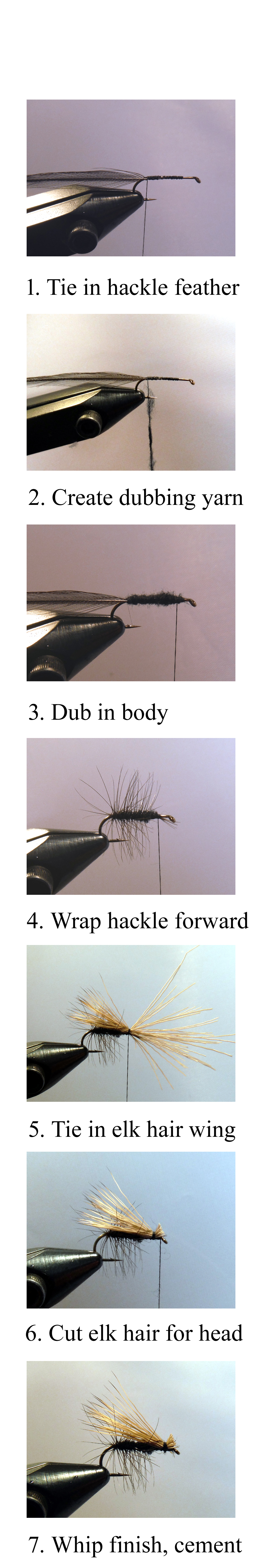At that point, select a small pinch of elk hair and place it tips-down into a hair stacker. Tap the hair stacker a couple of times on the desk to align the tips, and place them over the hook to form the wing of the fly; they should extend just a bit beyond the bend, but can be shortened or lengthened as preferred by the fish or the angler. Tie the wing in with four overlapping wraps (5). Trim the front section which has flared around the top of the hook by gathering it and lifting on it; cutting at an angle to form a triangular head (6). At that point, whip finish the fly going a couple times between the hair head and hook eye and a couple times over the tie-in point for the wing. Add a drop of head cement to the underside of the wraps for posterity, and the fly is complete (7).