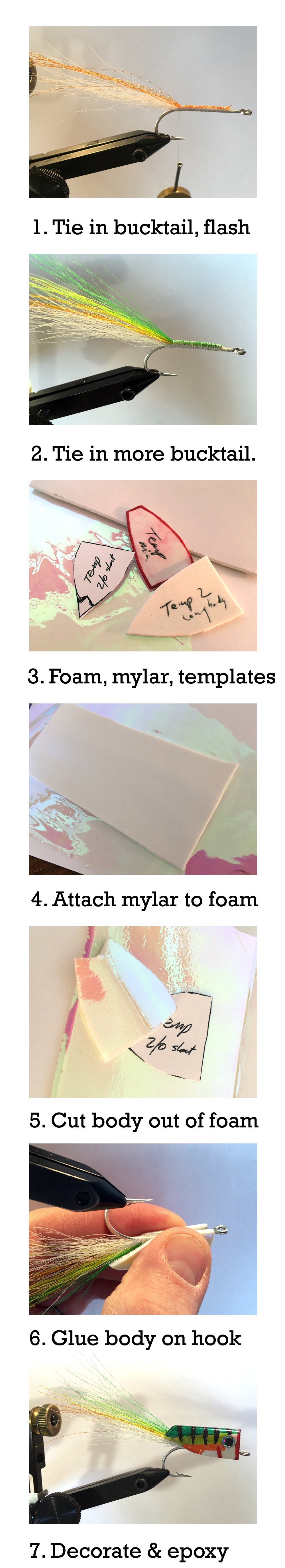 Create the body by taking a sheet of adhesive-backed foam and place the adhesive side down on a mylar sheet. It’s easier to do smaller strips of foam, so there aren’t as many wrinkles and bubbles in the mylar, but a few don’t hurt and add some texture to the skin of the pattern (3). Utilize a variety of templates for body styles and cut out the foam body for the fly (4). An elongated body will hold the tail down, a body with a clipped end will let it pop up and out of the fly for more action. Cut around the template to form the body to be used (5).