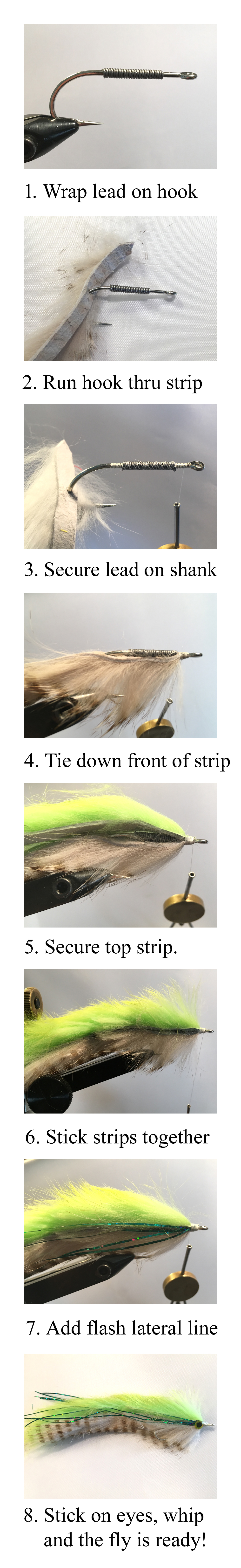 To form the lateral line, tie in a few strands of magnum flashabou on each side of the streamer (7). Once secure, whip finish and cement the thread head, and add a stick-on eye with a drop of head cement over the flashabou at the point just behind the thread head, where the body starts (8). With that, the fly is done and ready for a rush of spring pike!
