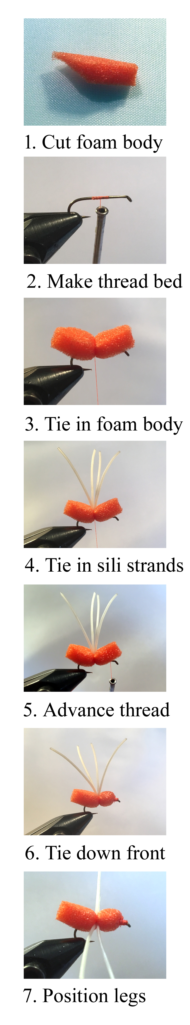 Lay the foam on top of the hook and using a couple of wraps of thread, secure it onto the hook shank so that the thin end starts just behind the hook eye and the point of the wider abdomen hangs out slightly over the bend. Then wrap a few more times to lock the foam in place (3). In the same spot, tie in the round silicone strands at the top of the fly to be used to form the legs which will be positioned in just a bit (4). Once the silicone strands are in place, gently lift on the front of the foam body and wrap the thread underneath it toward the hook eye (5).