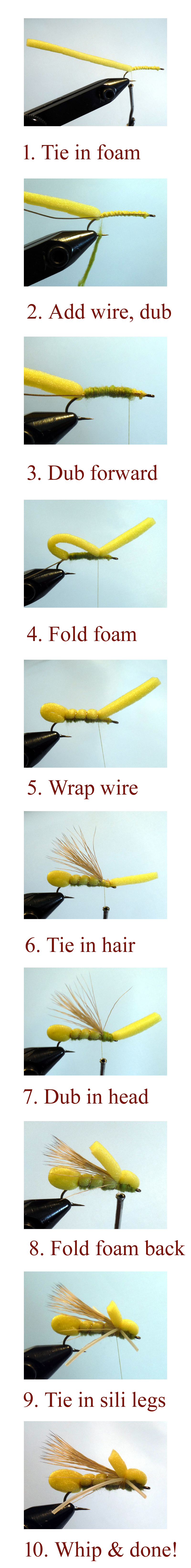 Fold the foam back over the fly, forming the top of the head by tying the remaining foam strip in place at the two-thirds point on the hook shank (8). Once secure, tie in a round silicone leg on each side of the pattern and trim them so that they are about as long as the tail in back and even with the head in front. Trim back the excess foam above the wing so just a little hangs out behind the head (9). Whip finish and add a drop of head cement to the bottom of the thread wraps and the foam hopper is complete (10).