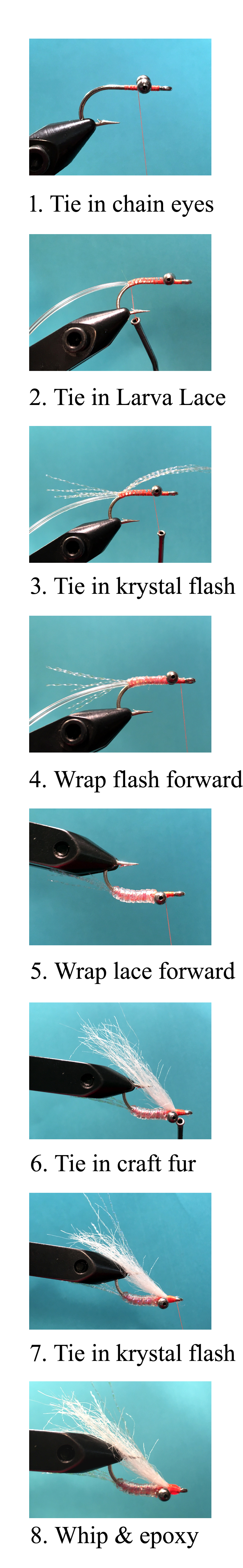 Start the fly by laying down a thread base about halfway down the hook and securing a pair of bead chain eyes a bit back from the hook eye, providing an area to tie in the wing later at the front of the hook (1). With the eyes in place tie in a three-inch strand of Larva Lace tubing down the hook shank (2). At the end of the shank, tie in 6-8 strands of krystal flash about four inches in length to form the tail of the fly which should be about the same length as the hook; then advance the thread to the bead eyes (3).