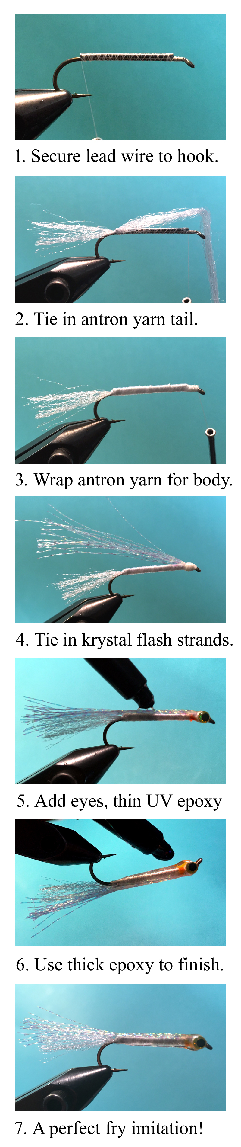 Fully customizable with different colored flash and an assortment of permanent markers, the epoxy fry is downright deadly on panfish like bluegills, crappies and white bass. The pattern is durable and realistic, making it a must-have for the long rod anytime the opportunity for these species presents itself. Have fun experimenting with epoxy, creating this amazing fly and the wide variety of variants that can be found for it, and in the process have a menagerie of minnows ready to go as soon as openwater arrives!