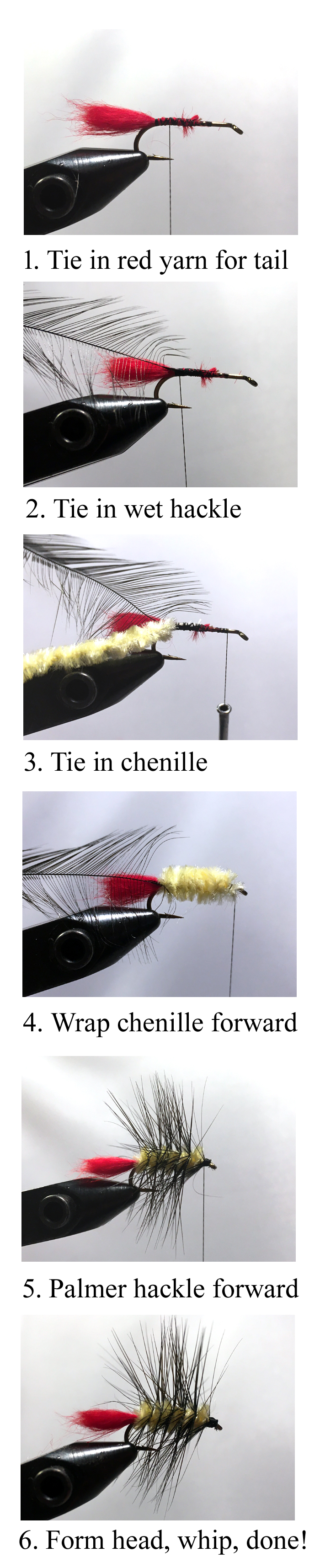 Wrap the chenille forward with tight wraps so that each one touches the previous wrap before it. Tie the chenille off a bit behind the hook eye so there’s room for a thread head and then trim off the excess material (4). Next palmer the hackle over the chenille with even wraps. You’ll notice a slight increase in hackle fiber length as you advance. Tie the hackle off and trim the excess in the same place as the chenille (5). Form a small thread head between the tie-down point and the hook eye, whip finish, cement and the woolly worm is complete (6).