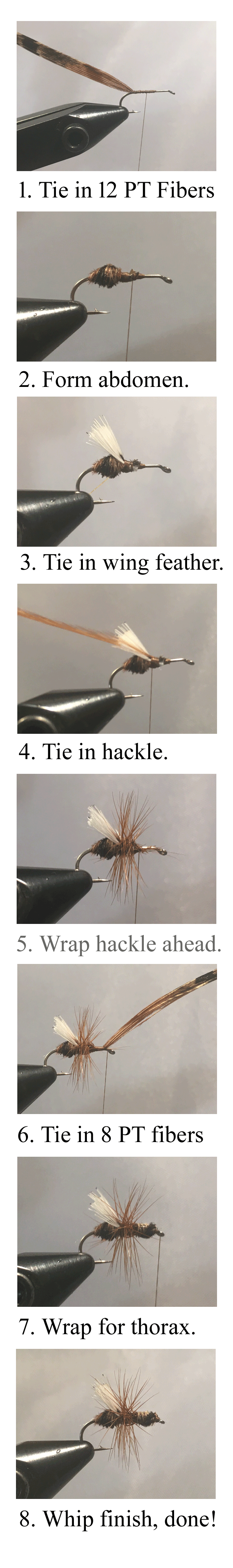 Next, tie in eight PT fibers by the tips, so that the bulk of them hang off the front of the fly and advance the thread (6). Wrap the fibers back and forward again, forming the thorax just in front of the hackling; once complete, tie off and trim the excess PT fibers (7). From there, whip finish the fly and the PheasAnt is complete and ready to fish (8).