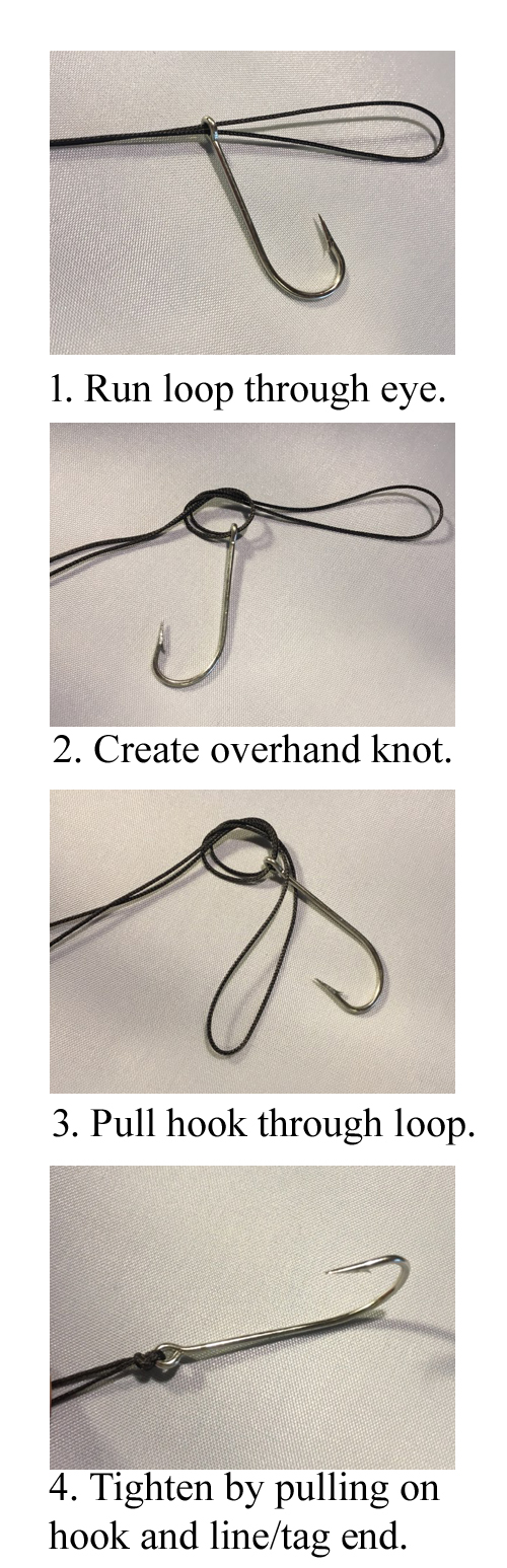 First, start by running a loop of line through the eye of the hook or jig in a length about one-and-a-half times as long as the lure (1). Be certain there is no paint or sealant in the eye of the lure as this will make running the doubled-over line through the opening difficult and can damage the line as the knot is tightened, weakening it when a fish strikes. Once the loop is formed, create an overhand knot by folding the loop back over and through the line, with the lure located on the doubled-up line in the middle of the bottom of the knot (2). From there, pull the hook through the loop (3). Using a bit of water or saliva, wet the line and pull on the lure and the doubled-up line and tag end of the knot. Wetting the knot will help prevent any friction and heat stress and preserve the integrity of the line. Pull the line until it is tight and the knot rests firmly against the top of the hook or lure’s eye. You should be able to see the two wraps resting snugly on top of one another (4).