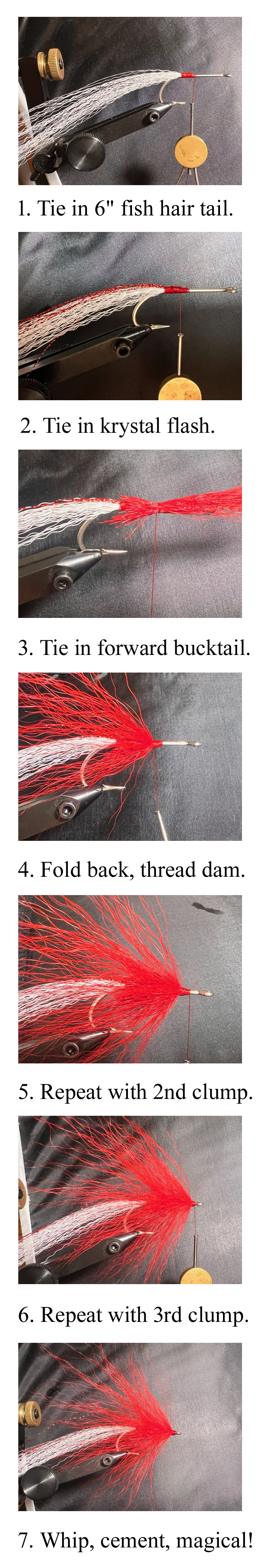 Repeat that process with a clump of bucktail to form the middle of the collar, securing them in place the same way with an angled dam that leaves room for a final clump behind the hook eye (5). Finally, tie in a final clump of bucktail, cut just a little shorter but angled back in the same way to finish off the collar with a thread dam that will become the fly’s head (6). Whip finish and cement the head and the Chip’s Northern Magic is complete (7).