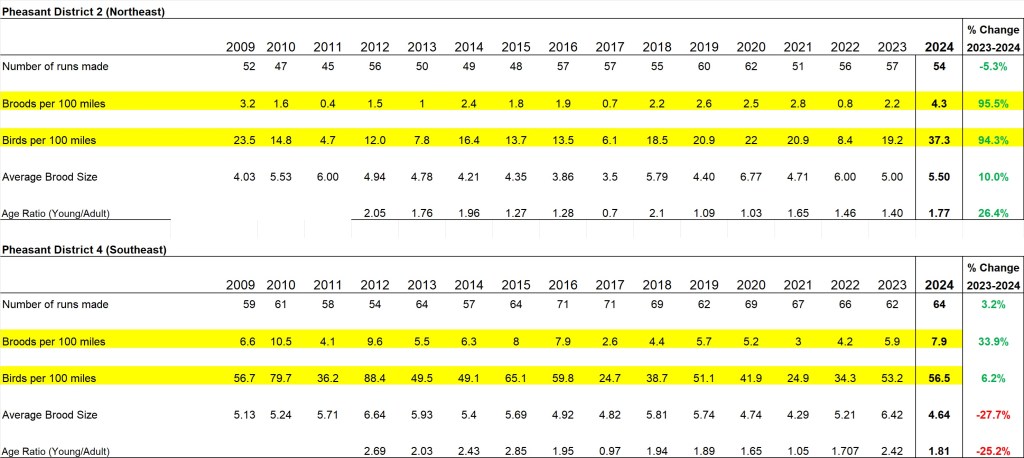 In North Dakota’s secondary pheasant range, the southeastern portion of the state posted modest gains with a 6.2 percent increase in pheasants observed, but a bump in broods counted by more than a third. In the northeast, which is bounded by the Missouri River on the west and I-94 in the south, pheasants observed jumped to 37.3 from last year’s tally of 19.2 and broods nearly doubled to 4.3 from 2.2 per 100 miles in 2023. Increases in the latter survey district typically were observed in those counties along I-94 and closer to the Missouri River.