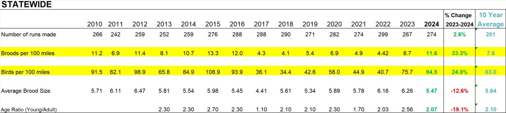 The northwestern survey district, which consists of an area roughly from the north shores of Lake Sakakawea west and north to the state line and Canadian border, was the showcase survey area, boasting bird tallies of 164 pheasants per 100 miles driven, up slightly from 2023, and the highest it has been in the last 10 years. Broods counted were also up, with nearly 21 seen per 100 miles driven, the second consecutive 10 year high after a nine-year average of just 6.6 broods from 2014 to 2022.