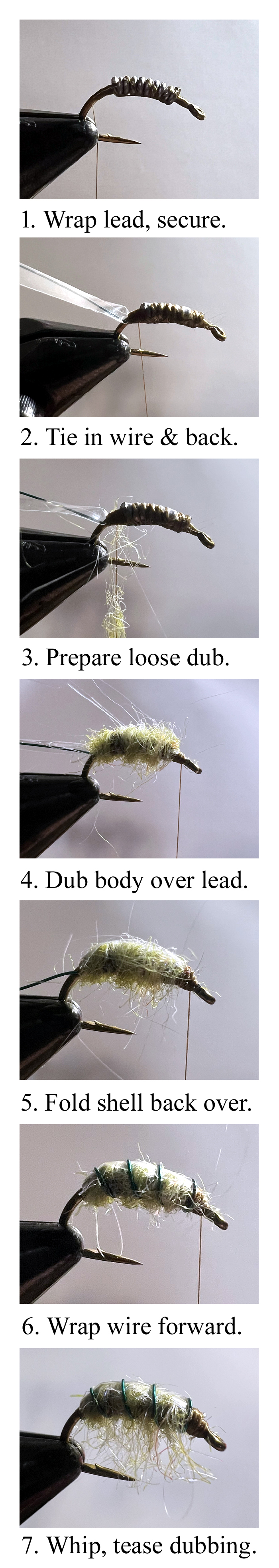 From there, gently wrap the wire around the body of the fly, forming an even, segmented appearance similar to the body of a scud; tie off and trim the excess wire a bit behind the hook eye and cover it with thread (6). Once secure, form a small thread head which transitions down from the shell evenly, then whip finish and cement for posterity. When complete, use a needle to tease out some of the dubbing on the underside of the fly to create the illusion of the many legs that freshwater shrimp sport in the wild. Then, your simple scud is complete (7)!